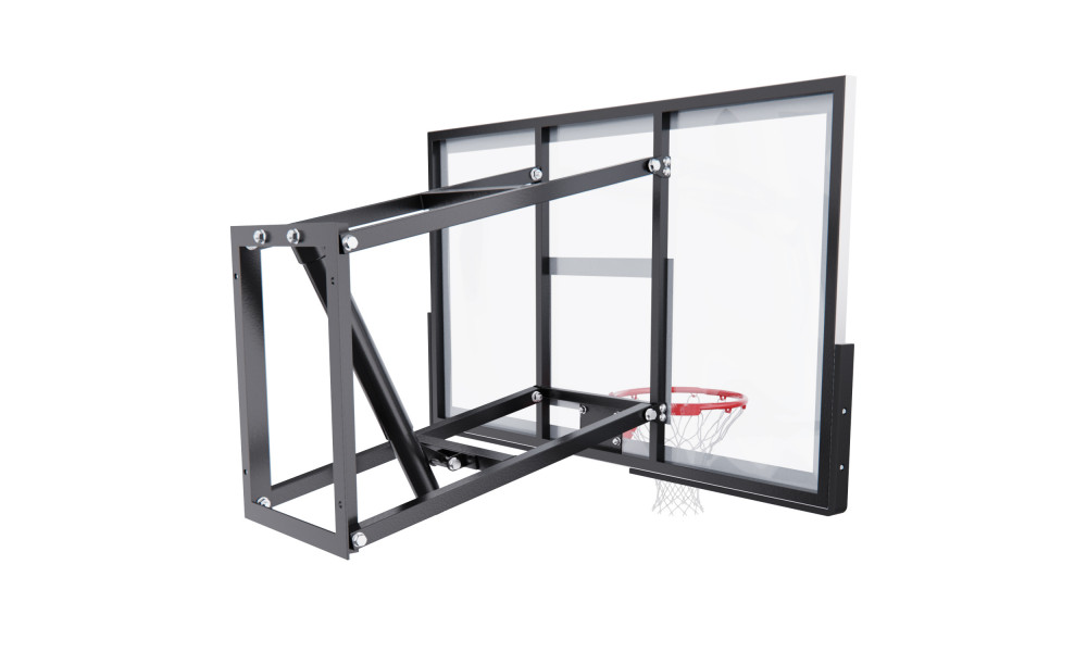 Щит изготовлен из прочного поликарбоната толщиной 3 мм — материала, обеспечивающего хороший отскок мяча и устойчивость к ударам. Его размеры — 136 х 80 см, что делает его максимально приближенным к профессиональному оборудованию. Регулируемый вынос щита (51–55,5 см) повышает безопасность и удобство во время игры. Дополнительную безопасность обеспечивает защита Poly Pade, установленная по нижнему краю щита.
