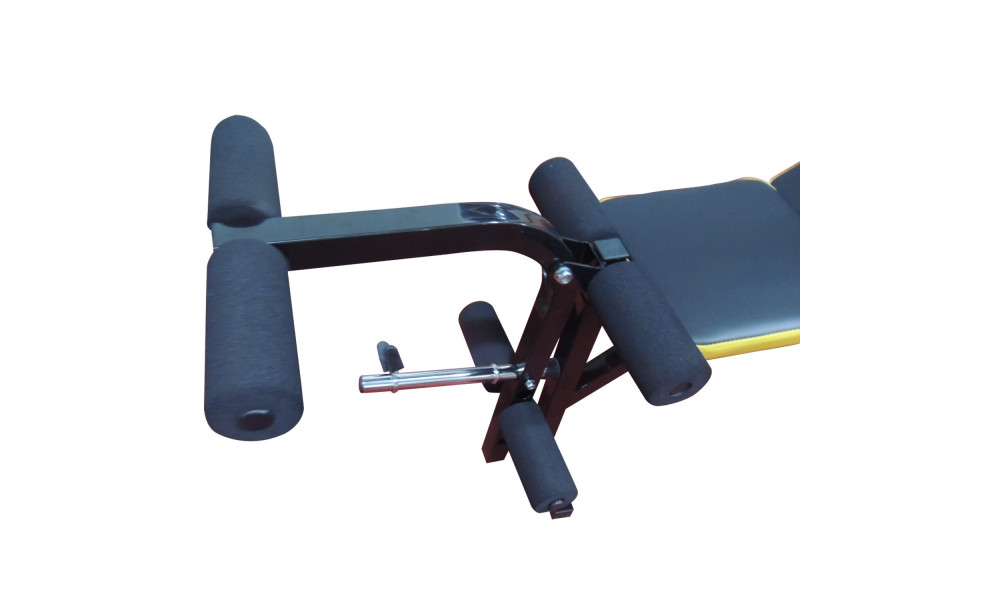 Усиленные стойки для штанги надежно фиксируют штангу, что обеспечивает безопасность при выполнении упражнений. Рычаг для ног снабжен мягкими валиками. Регулируемый угол наклона спинки.